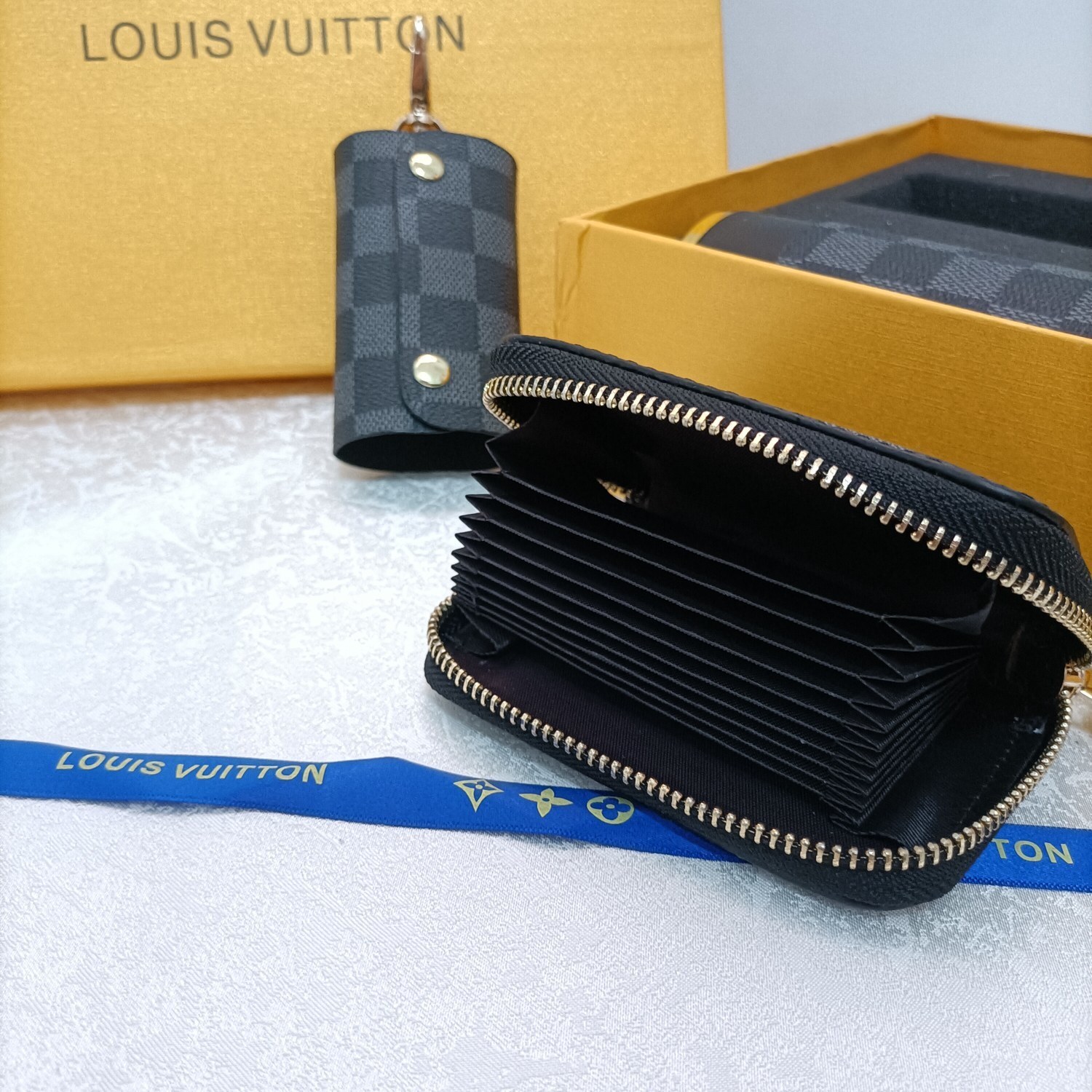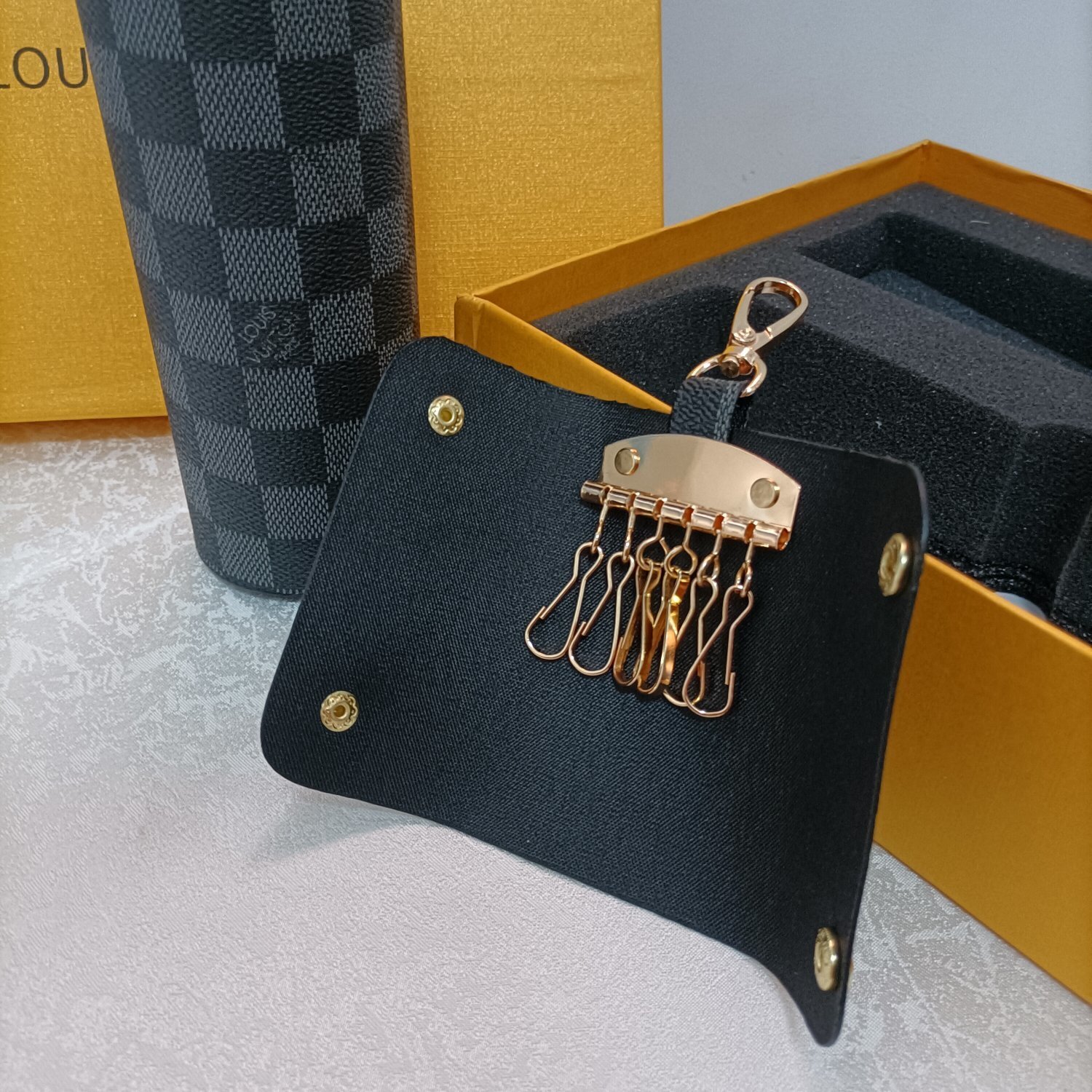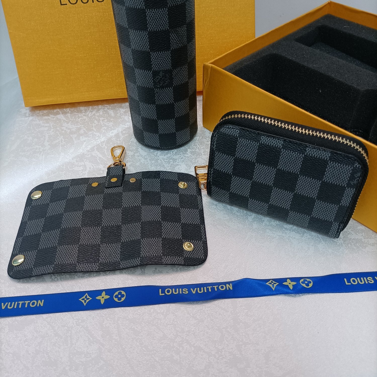 wallet tumbler Louis Vuitton Damier Graphite Gift Set - The Louis Vuitton Damier Graphite Gift Set is the epitome of luxury and sophistication. This meticulously curated set includes a wallet, a tumbler, and a key holder, all adorned with the iconic Damier Graphite pattern. Perfect for the discerning individual who appreciates fine craftsmanship and timeless design, this set is a statement of elegance and style. Whether you're treating yourself or searching for the perfect gift, the Louis Vuitton Damier Graphite Gift Set is sure to impress.