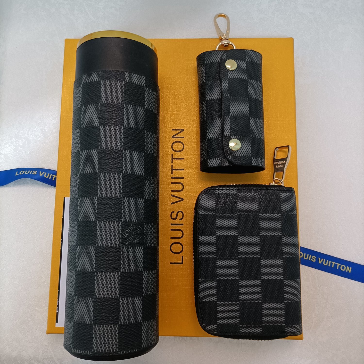 The wallet and key holder are crafted from premium leather with the Damier Graphite pattern. The tumbler is made from high-quality stainless steel.