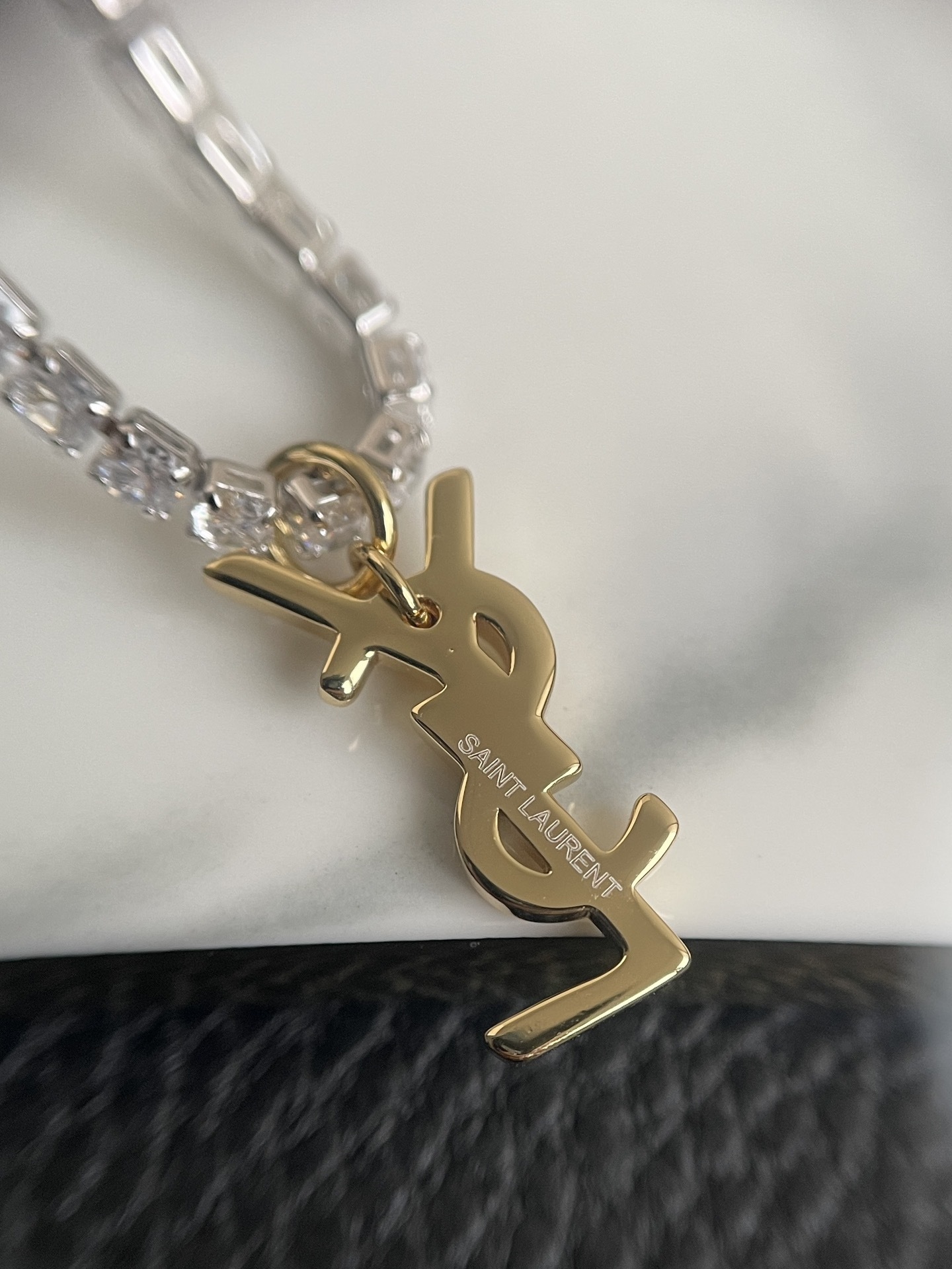 YSL Gold Crystal Chain Necklace - Elevate your style with the exquisite Saint Laurent Gold Logo Crystal Chain Necklace. This stunning piece combines the timeless elegance of Saint Laurent with a modern, sparkling design. Featuring the iconic YSL logo in gold tone, adorned with a delicate crystal chain, this necklace is the perfect accessory to add a touch of luxury to any outfit. The Saint Laurent Gold Logo Crystal Chain Necklace is more than just jewelry; it's a statement of sophistication and refined taste. Whether you're dressing up for a special occasion or adding a touch of glamour to your everyday look, this necklace will undoubtedly turn heads and capture attention.