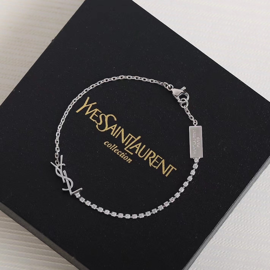 ysl Saint Laurent Silver Crystal Bracelet - Elevate your style with the exquisite Saint Laurent Silver Crystal Bracelet, a stunning piece that embodies elegance and sophistication. This delicate bracelet features shimmering crystals and the iconic YSL logo, making it a perfect accessory for any occasion. The Saint Laurent Silver Crystal Bracelet adds a touch of luxury to your everyday look and is ideal for both casual and formal wear.